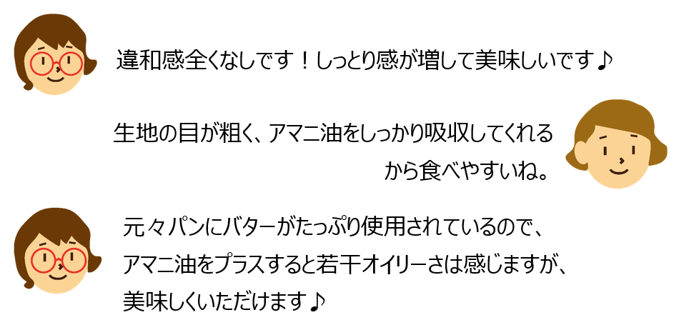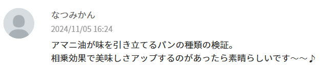 パンとアマニ油はあうので、引き続きパン食にもアマニを継続して旨みアップにつなげていきたいと思います。ありがとうございました!