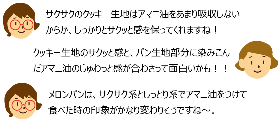 理由:メロンパンのサクッふわっ食感に、アマニ油のじゅわっと感が合わさって面白いから。