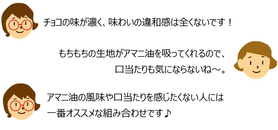 理由:チョコの味が濃いので、アマニ油の風味が苦手な人には一切違和感なく食べられるから。