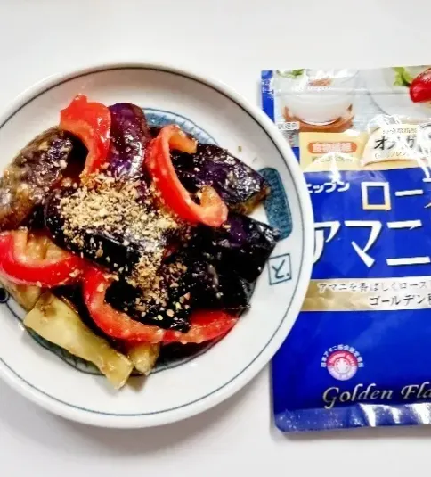 ナスとパプリカの甘味噌あえを冷やしてアマニ粉末をかけたものです✨
